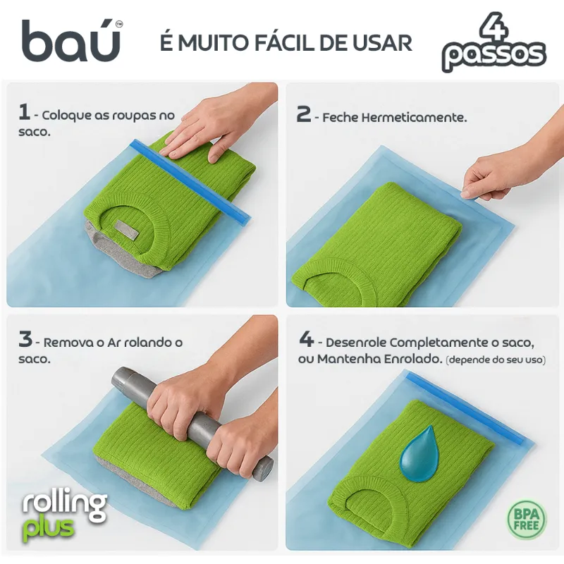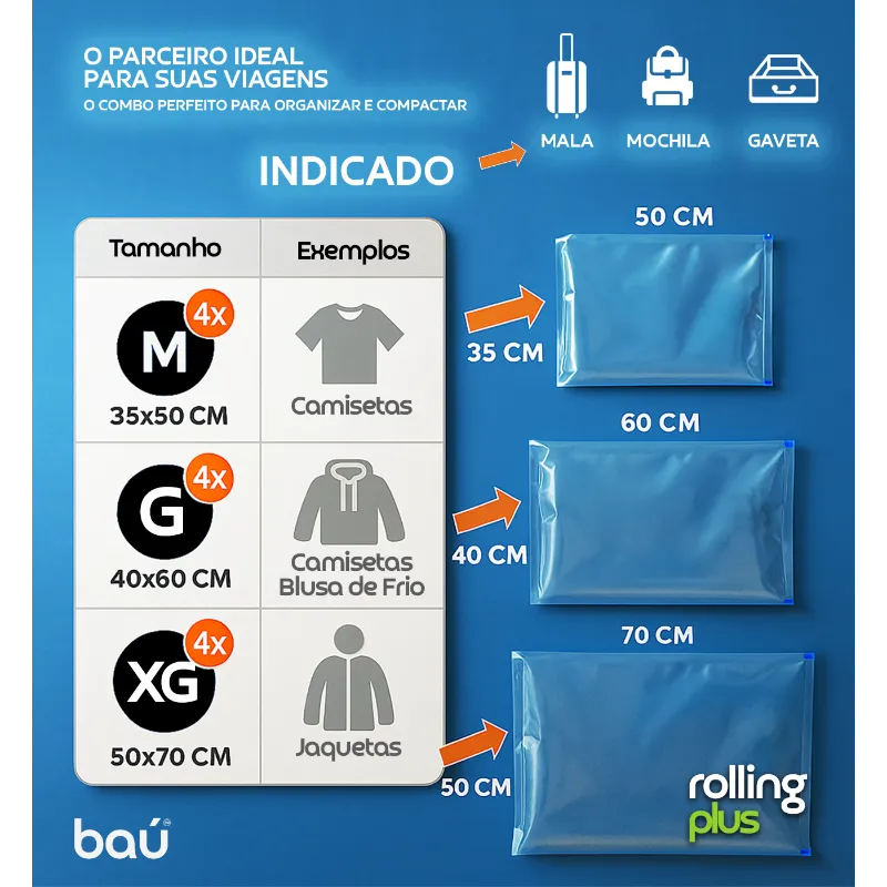 Kit 12 Sacos a Vácuo de Enrolar (M, G, XG) Rolling Plus - Baú